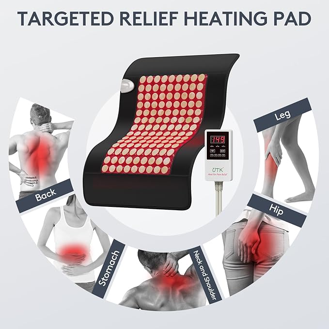 - 【5X Deeper Pain Relief Back Heating Pad】: Unlike other heating pads, UTK infrared heating pad uses advanced far-infrared technology. Carbon fiber heating releases negative ions and far-infrared heat that penetrates 4-6 inches deep into the skin, effectively promoting blood circulation, relaxing muscles, and relieving post-exercise muscle soreness and joint stiffness from prolonged sitting, providing gentle soothing relief.