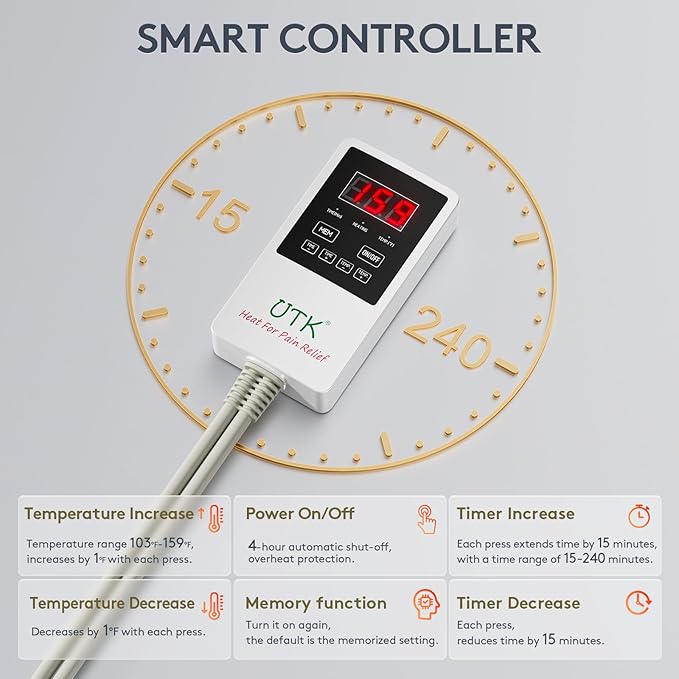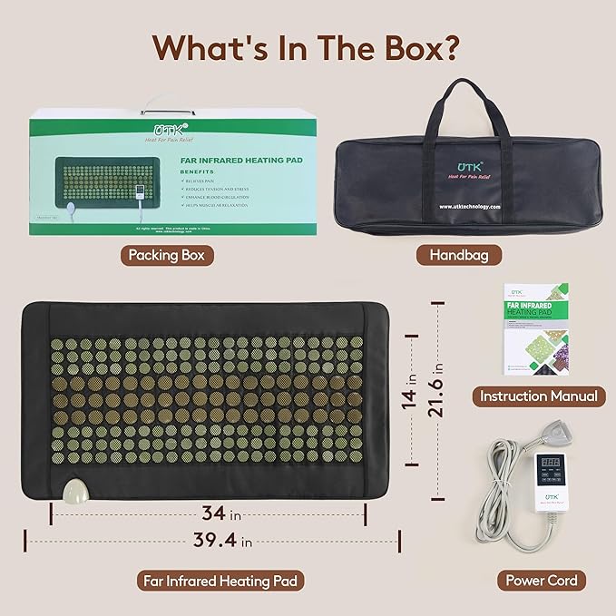 - 【5X Full Back Pain Relief】: Unlike other heating pads, UTK infrared heating pads have built-in carbon fiber heating wires that can release more efficient far-infrared wavelengths, deeply penetrate the body's muscle tissue. The temperature can reach up to 159°F, which is 10-15°F higher than other products, and has a more than 3-times better heat therapy effect. Deep far-infrared heat can relieve muscle soreness, stiffness, and arthritis and promote blood circulation. Long-term use has a soothing impact on chronic pain, long-term sitting in the office, or muscle fatigue after exercise.