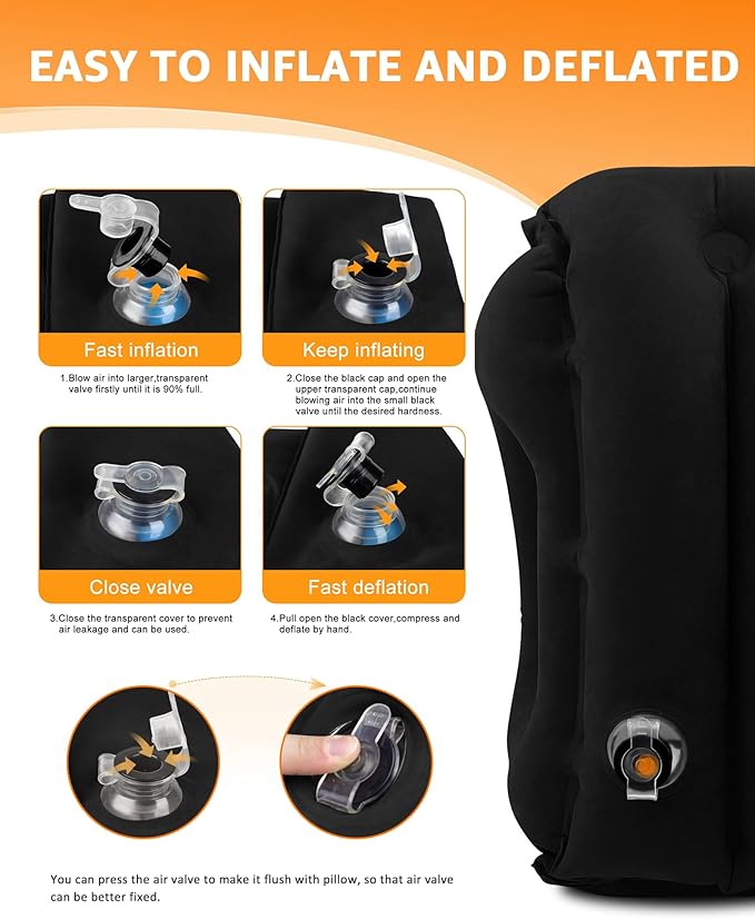 - 【Inflate And Deflate Easily】Airplane neck pillow has a 2-in-1 double valve design.The upper black air valve is a one-way air inlet for inflating or replenishing gas.bottom transparent air valve can be quickly inflated and deflated,when you are done blowing it up, push clear cover on and push whole valve in so that it is flush with the side of the travel pillow.