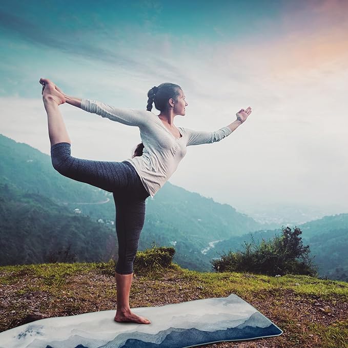QIYI Large Yoga Mat Towel with Corner Pockets, Non Slip Sweat Absorbent Hot Yoga Towels, Soft Yoga Blankets with Travel Bag, Skidless Mat Cover for Workout, Gym, Fitness - 74"x26", Watercolor Mountain