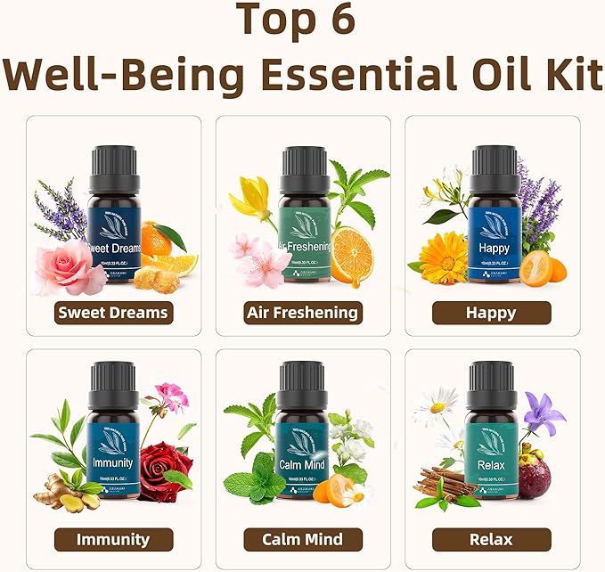 - [Globally Sourced Materials] Introduce the long-lasting, pleasant, and relaxing aroma to your home with our Well-being aromatherapy diffuser oils set! Happy, Calm Mind, Air Freshening, Relax, Immunity, and Sweet Dreams inclued for your well-being and happy life . The scent of plants is effectively preserved using the low boiling point extraction procedure. No carriers, alcohol, or animal testing are used in any of our essential oils
