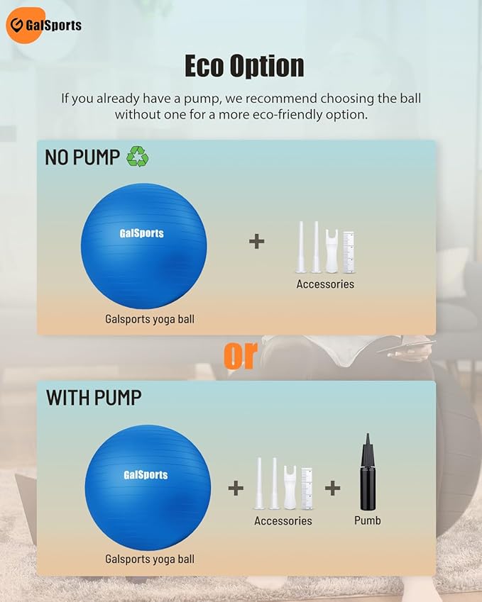 - 【Less Carbon Footprint, Greater Value】 We offer two options: the exercise ball with a pump and without a pump. Please kindly choose the ball without a pump if you’ve had one to join us on a mission to reduce our carbon footprint and protect our environment.