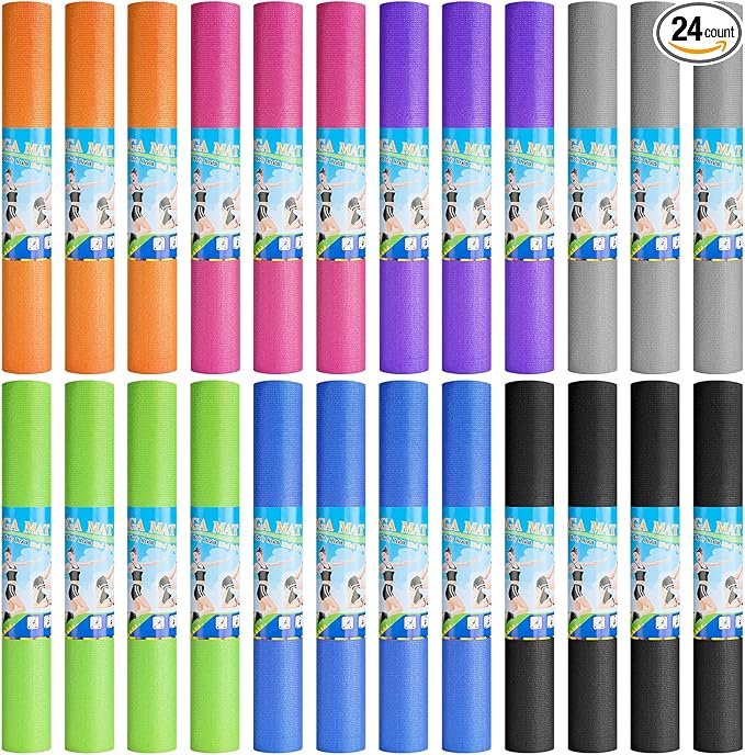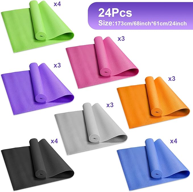 - Large Quantity: the package comes with 24 pieces of yoga mats bulk in 7 different color, including 3 pieces of orange yoga mats, 4 pieces of dark blue yoga mats, 3 pieces of rose red yoga mats, 4 pieces of green yoga mats, 3 pieces of gray yoga mats, 3 pieces of purple yoga mats and 4 pieces of black yoga mats, enough to meet your use and replacement demands