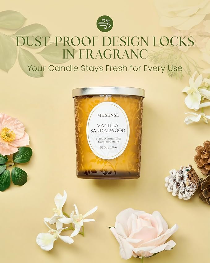 M&SENSE Vanilla Sandalwood Candle, Cracking Wooden Wick Soy Wax, 18oz 100 Hours Long Lasting Clean Burn, Large Jar Candles for Home Scented, Non-Toxic Relaxing Aromatherapy Gifts for Women