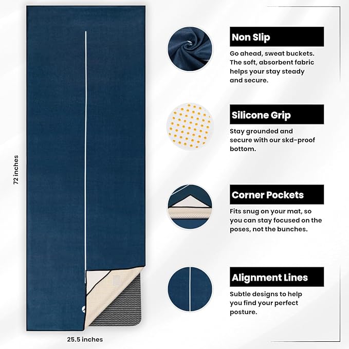 Yoga Grip Yoga Towel - Non Slip Hot Yoga Mat Towel With Corner Pockets, No-Skid Grip, and Built-in Alignment Lines | Soft, Moisture Wicking, and Sweat Absorbent | No Bunching, Stays in Place 72" x 25"
