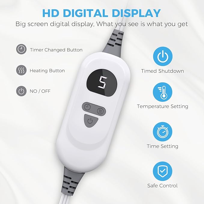 - Easy to Use: You just press and hold the three-second switch button to turn it on. This heat pad has six levels of temperature adjustment, from 108℉ to 144℉ and four levels of time setting, from half an hour to two hours to meet your different needs