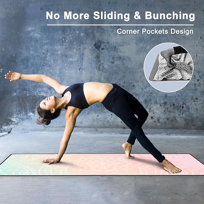 - Corner Pockets Design: Features 4 corner pockets on the backside, the non slip yoga mat towel helps secure and hold onto the mat firmly. This allows you to focus your mind, body and breath on the yoga practice, without worrying about bunching.