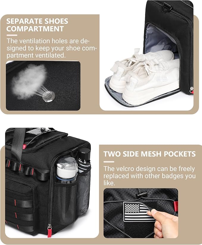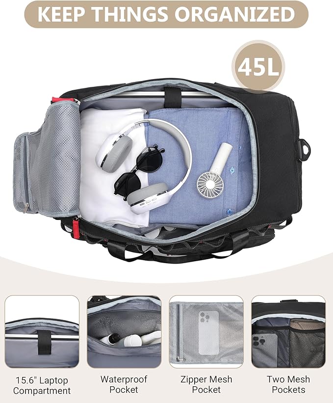 • 45L Large Capacity Duffle Bag: MCBD gym bags for men/women are spacious enough to hold 4-5 days of travel clothing and daily necessities, meeting your travel needs. This sports bag has multiple compartments, including a separate shoe compartment, a 15.6-inch laptop compartment, wet pocket, water bottle pockets, and other pockets. Also comes with an extra toiletry bag. Let your items be stored in a convenient and organized space for easy access. Size: 21.3” × 12.2” × 10.7 ”.Black