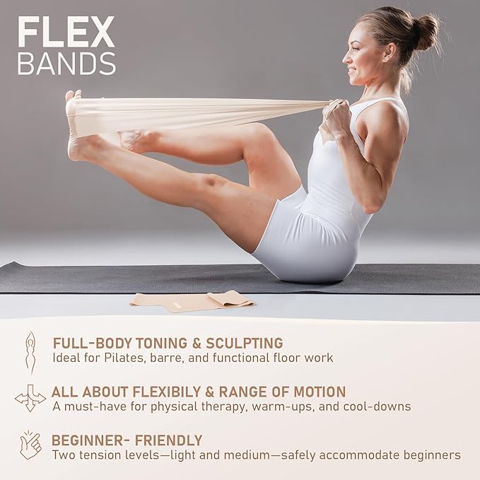 - 3+2 Resistance Bands System- With three non-slip mini bands and two flex bands offering light to heavy tension, this Pilates equipment set accommodates beginners to intermediate users for strength training, rehabilitation, and booty workouts.